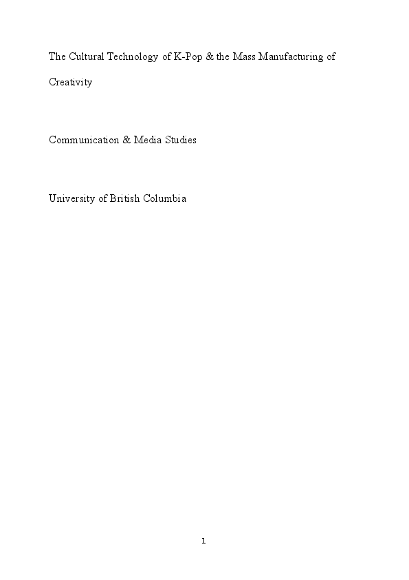 Dissertation on Kpop . The Cultural Technology of K-Pop & the Mass Manufacturing of Creativity Communication & Media Studies University of British Columbia 1 f Abstract The aim of this dissertation is to identify how the theory of cultural industry applies to the Korean pop music industry . It argues that K-pop is not only a perfect fit for the . . .