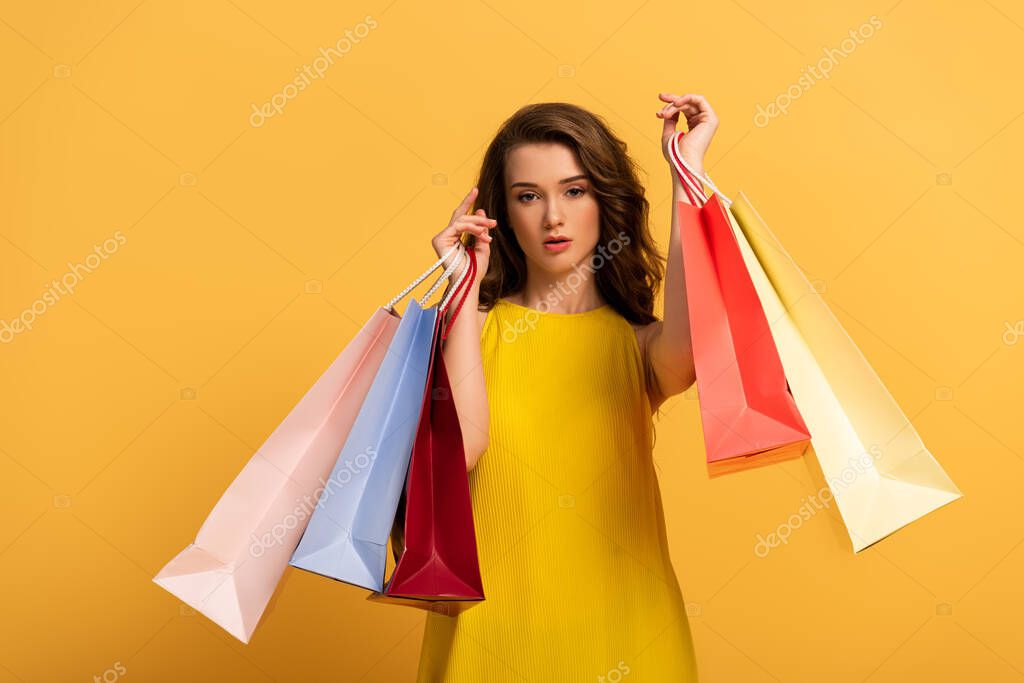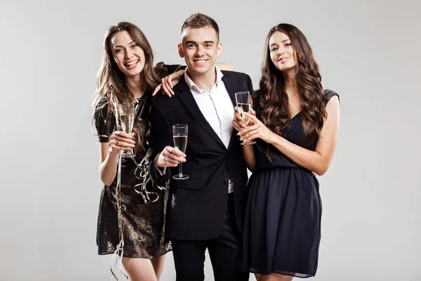 AndrewLozovyi Элегантные блондинки и брюнетки женщины в атласных платьях, смотрящие в камеру, изолированную на сером