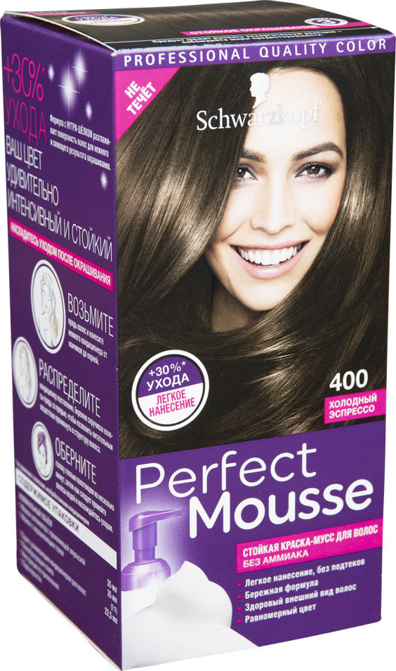 Стойкая краска-мусс Perfect Mousse легко наносится, как шампунь, и равномерно распределяется благодаря текстуре мусса . Краска-мусс Perfect Mousse не содержит аммиака и придает волосам сияющий и стойкий . . .