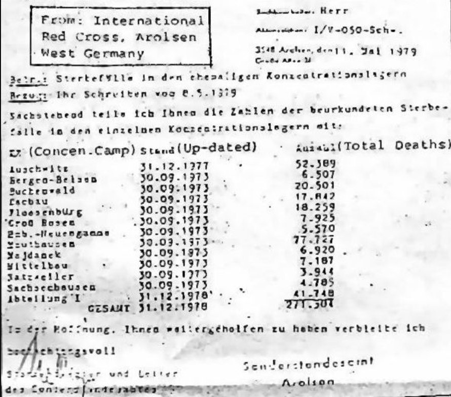 «В условиях хаоса, начавшегося в Германии после вторжения, в течение заключительных месяцев войны лагеря не получали продовольствия вообще, и голодание стало причиной большого количества смертей. Встревоженное этой ситуацией, 1-го февраля 1945 года немецкое правительство, наконец, сообщило об этом МКК...