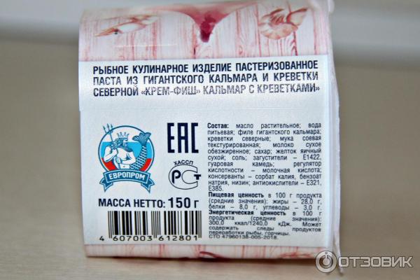 Привет любителям рыбных паст, риетов и паштетов! На днях в одном из маркетов «Магнит» пасту «Крем-фиш» кальмар креветка от Европром можно было купить со скидкой за 59 рублей, что я, собственно, и сделала .