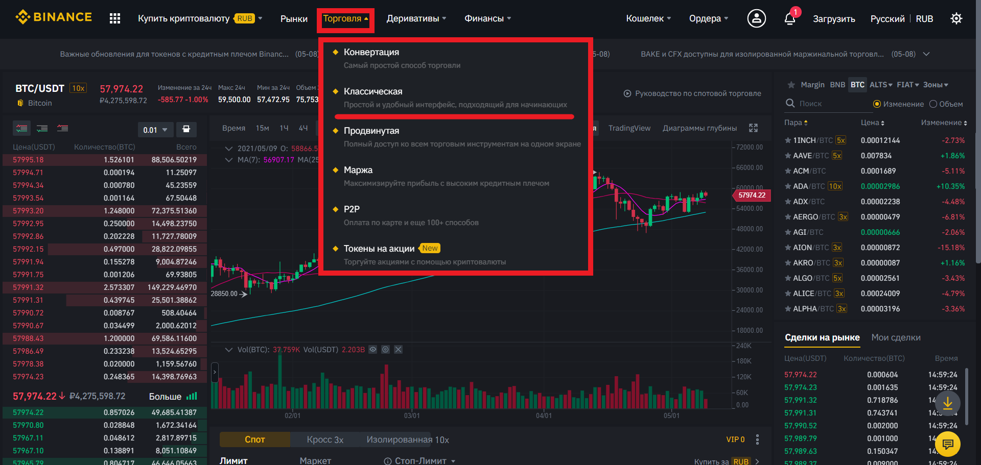 Интерфейс биржи.