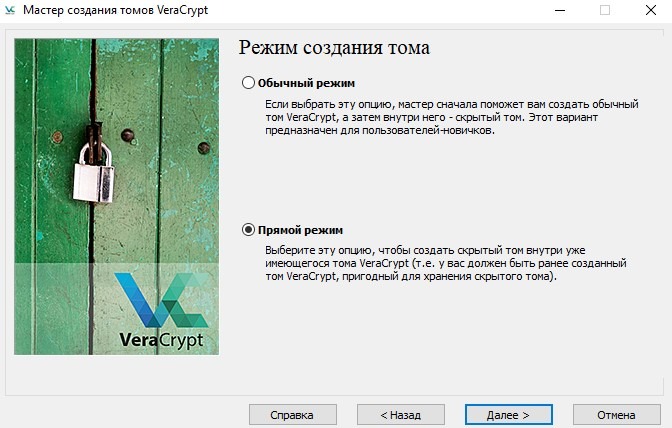 Существует два режима создания тома, их подробное описание указано на скриншоте. Как вы можете увидеть, опция "Обычный режим" предназначена для тех, кто еще не создал обычный том, но так как он у нас уже имеется, то кликаем на "Прямой режим".