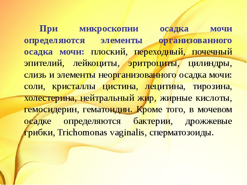 Обычно это оксалаты, ураты, фосфаты . Параллельно нередко повышается кислотность мочи . Желтый цвет примесям в моче придают кристаллы билирубина, лейцина, тирозина .