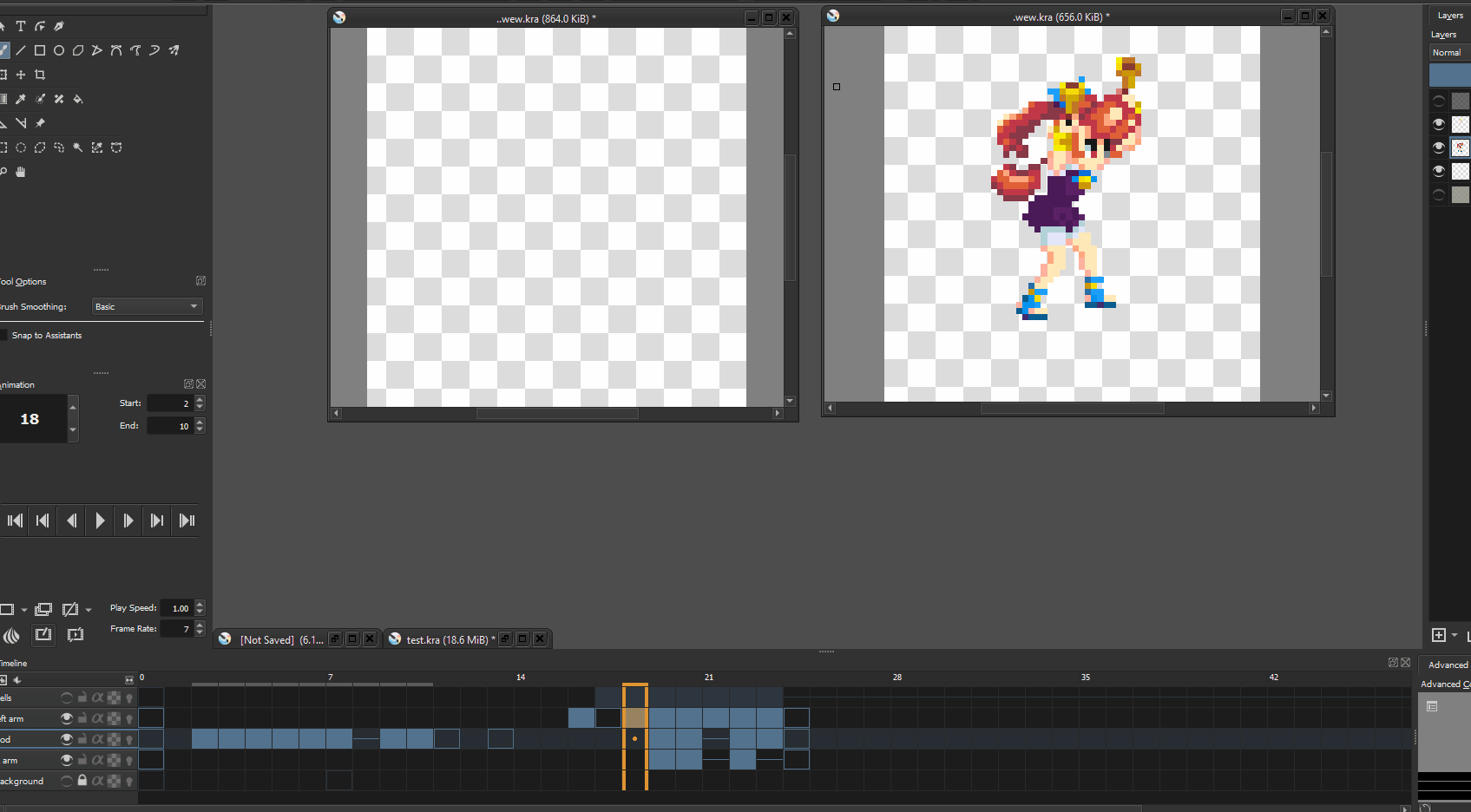 Details as to recurring bug... I'm unable to pinpoint how it starts (but it never fails to reveal itself at some point while I'm working). The gist is there's an additional frame that shows itself where her arms in the left window aren't raised. The animation should just be her repeatedly jumping with the bells above her head). At some point, while re-playing highlighted portions of this specific animation in the central layer (where you see me highlighting frames), her arms lower for one frame.