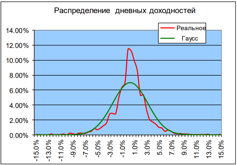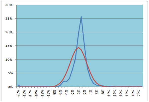 Форма кривой улыбки волатильности имеет простое объяснение: дело в том, что фактическое распределение дневных изменений цен базисного актива отличается от принятого в теории лог-нормального распределения о котором я писал ранее. Это связано с свойствами реальных изменений цен акций.