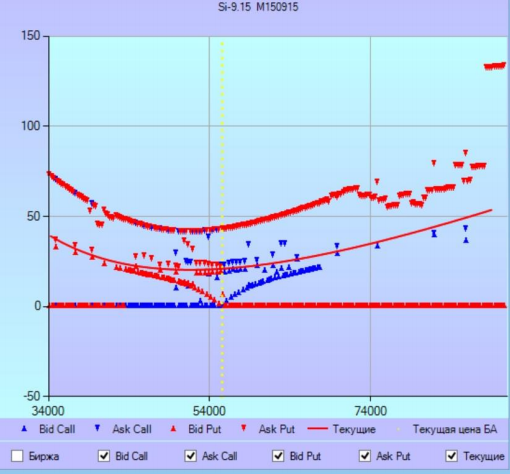 В результате при изображении сложившихся на торгах цен опционов и соответствующей им подразумеваемой волатильности на графике можно увидеть так называемую улыбку волатильности (volatility smile)