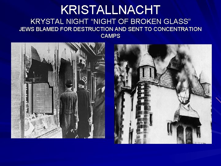 On November 9 to November 10, 1938, in an incident known as "Kristallnacht", Nazis in Germany torched synagogues, vandalized Jewish homes, schools and businesses and killed close to 100 Jews .