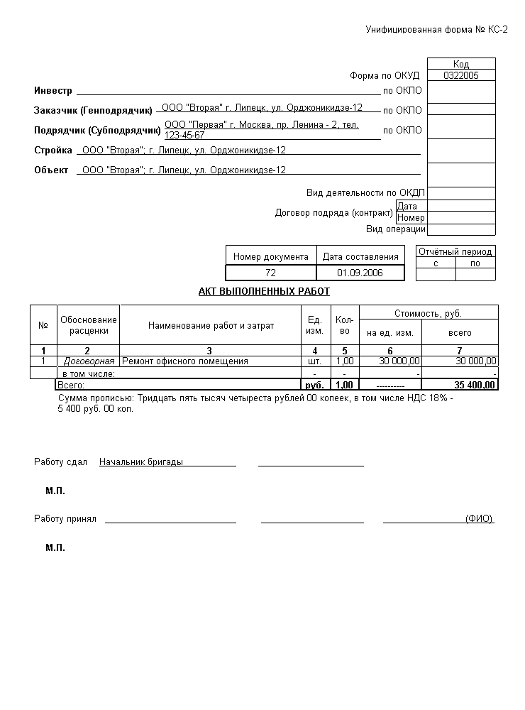 Акт о приемке выполненных работ КС- 2 заполнить, распечатать онлайн бесплатно