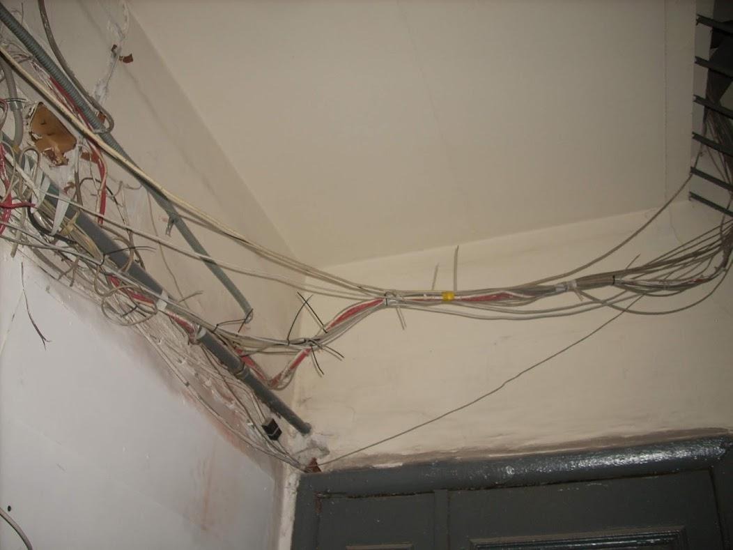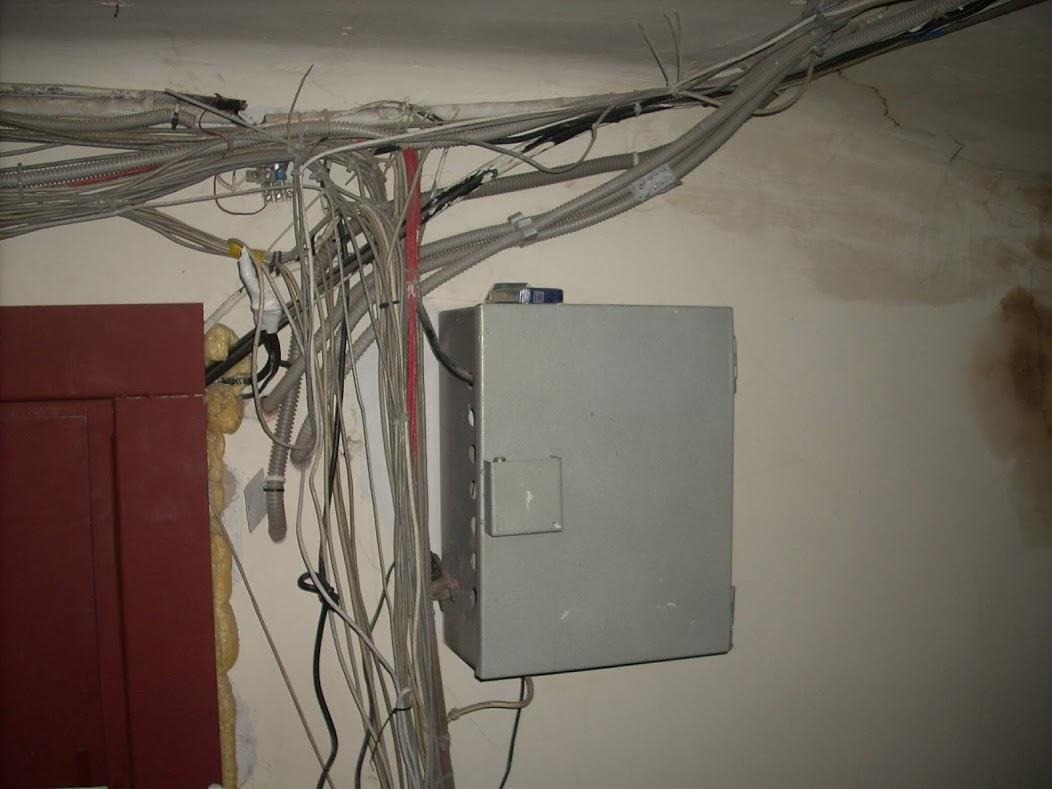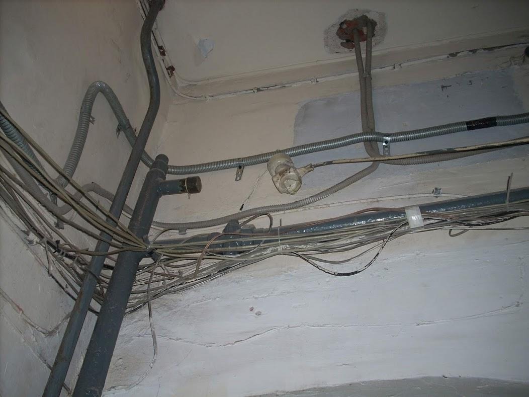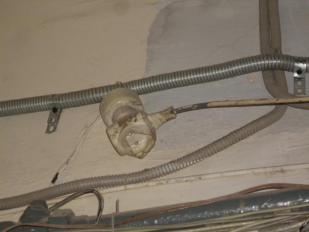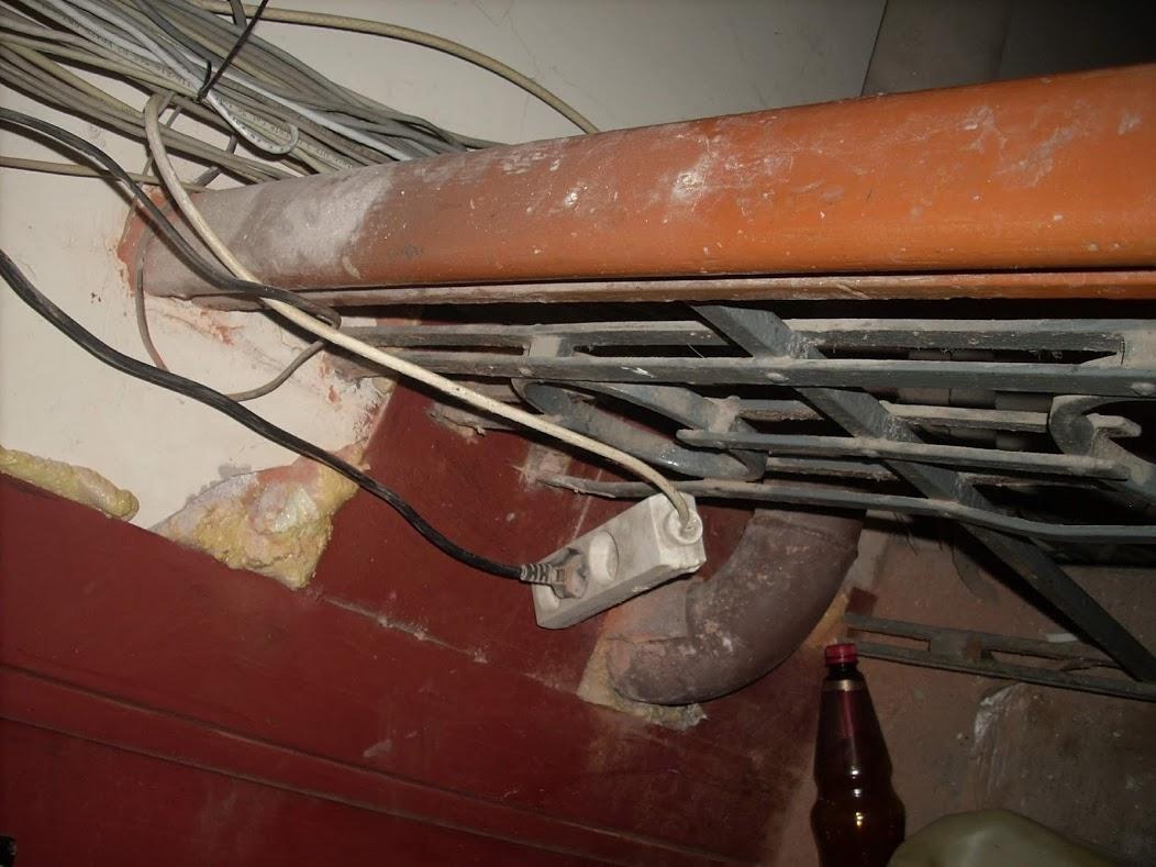 В розетку воткнут тройник, из которого идёт удлинитель.Отчётливо видно, что тройник оплавлен.Попробуем отследить кабель. Поднимемся с последнего жилого на технический этаж.Тадам! Есть ящик. Но! К нему 220V не приходит, внутри вероятно пассивное оборудование или он ещё не запущен в эксплуатацию. Ищем дальше.Интересующий нас кабель заходит в этот висящий в воздухе очередной тройник. Отслеживаем то, что воткнуто в него.И вот наш вероятный победитель! С оторванной крышкой и характерной бутылкой внутри. Кабель уходит в левый ящик.