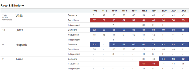 Характерной чертой американской избирательной системы является высокая степень корреляции политических предпочтений не только с доходами и образованием, но и с этническим происхождением, возрастом и полом.