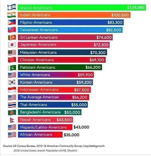 При этом нельзя не заметить, что политические предпочтения евреев (79% за демократов/17% за республиканцев) схоже с другой общиной с очень высокими уровнями доходов – индусами (71/13), а в большей степени за демократов голосует только беднейшая из крупных этнических групп в США – чернокожие (91/6). При сравнении электоральных предпочтений азиатских групп и их средних доходов, можно заметить что китайцы и корейцы, наиболее близкие к белым по уровню доходов, также и имеет более близкие к «белым» расклады в электоральных предпочтениях