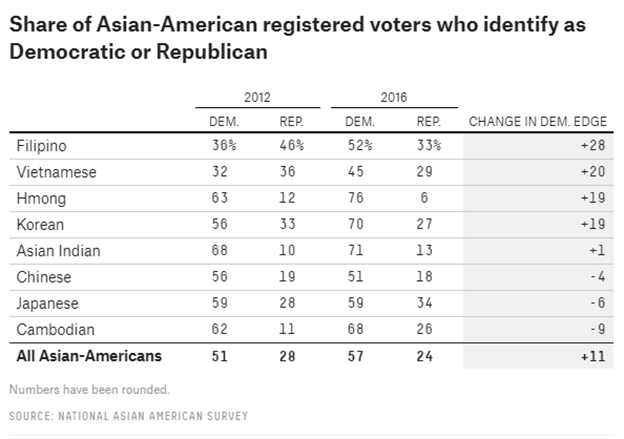 Также обращает на себя внимание тот факт, что азиаты со временем сдвигаются на более про-демократические позиции, причем несмотря даже на то, что азиатские американцы – общность довольно условная, поскольку выходцы из разных стран отличаются достаточно сильно. Причем наиболее сильный подъем популярности демократов заметен среди прежде про-республикански настроенных филиппинцев и вьетнамцев. В случае с вьетнамцами очевидно влияние того фактора, что все большую долю составляют выходцы из (пост)социалистического Вьетнама, а роль бывших беженцев с побежденного Юга все меньше. Однако это слабо объясняет изменения в среде индийцев или корейцев.