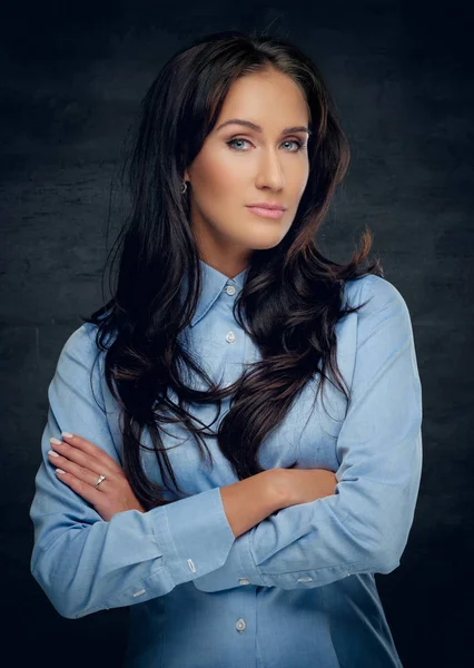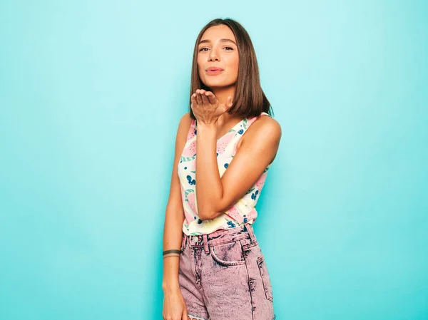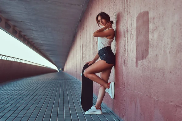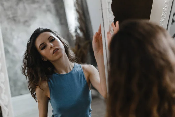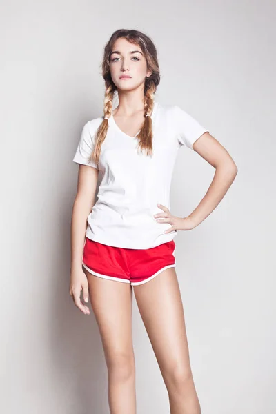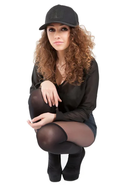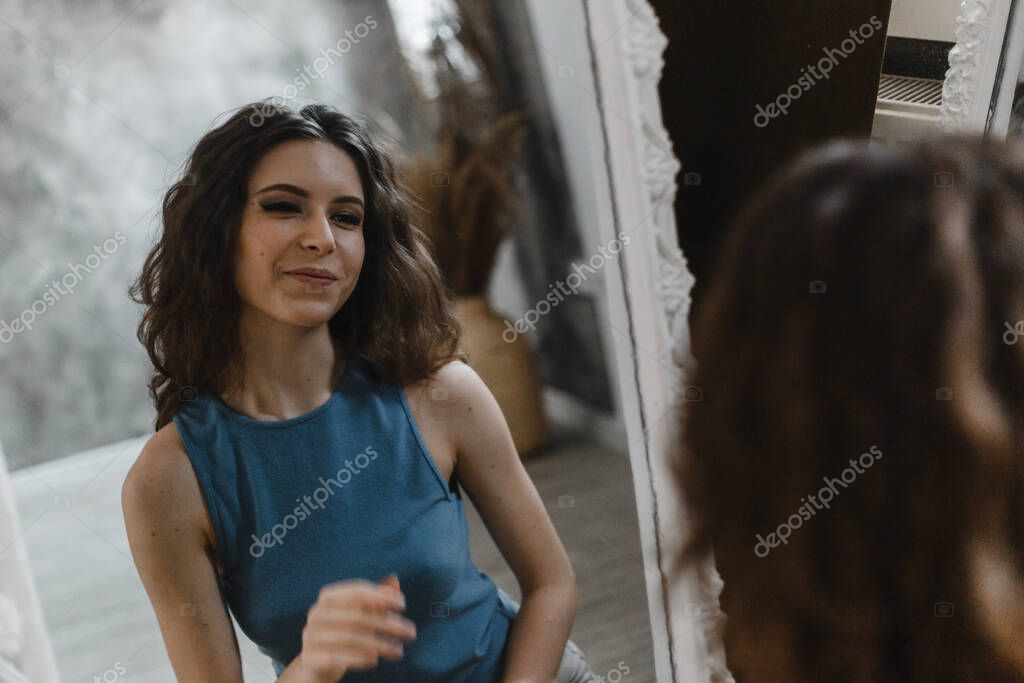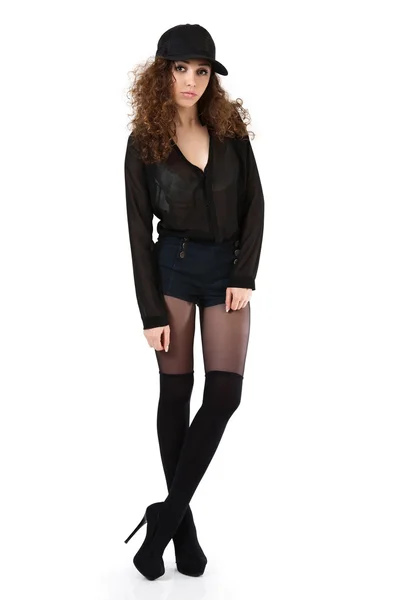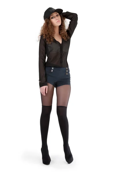 Кудрявая брюнетка в майке и шортиках