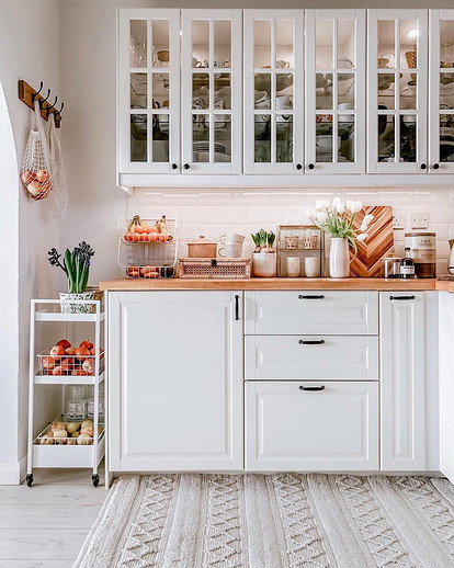 На фото малогабаритная кухня в стиле кантри с п-образным деревянным гарнитуром с плиточной отделкой . Для потолка будет более уместна покраска или побелка .