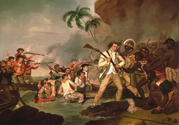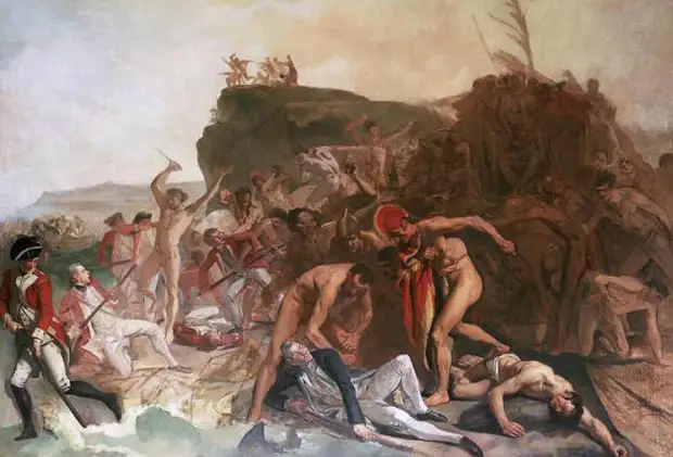 Это было объявлением войны. Женщины и дети исчезли. Мужчины надели защитные плетеные маты, в руках их появились копья, кинжалы, камни и дубинки. Кук зашел по колено в воду и повернулся, чтобы подозвать лодки и приказать прекратить огонь. В этот момент на его голову обрушился сокрушительный удар деревянной дубинки. Когда он падал, другой воин нанес ему удар кинжалом в спину. Через час после того как он сошел на берег, Кук был мертв.