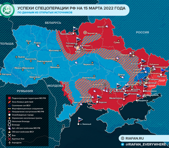 К исходу третьей недели «не-войны» можно констатировать, что явно или неявно, но Киев пошел по этому сценарию, который, впрочем, напрашивался, так как российское руководство и командование сделали все возможные просчеты из всех имеющихся. Размазанный по огромному периметру границы воинский контингент, недостаточный даже для втрое-вчетверо менее масштабной операции, очевидным образом «застрял». Карты-раскраски, которыми пестрят ресурсы, и на которых щедро закрашены подконтрольные РФ территории, в реальности — это контроль дорог и не самых больших населенных пунктов. За пределами дорог и некоторых их точек связности по сути контроля нет. Безусловно, такому размаху можно найти объяснение — попытка лишить маневра группировку вокруг Донбасса, но суть от этого не меняется: ресурса для масштабов проводимой операции у России просто нет. А есть что есть, и его предсказуемо мало. И даже не по причине героизма защитников, а просто потому, что невозможно размазать 5 грамм масла на лоток хлеба.
