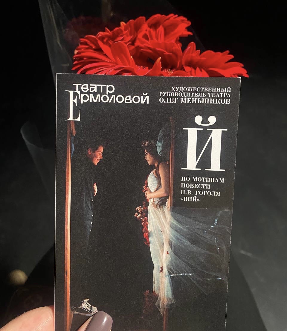 «Й» в театре им. Ермоловой. (Почти Вий, про любовь) Мистическая повесть Н.В. Гоголя с элементами современности на Новой сцене. Интересная интерпретация сюжета, плюс отсутствие сцены в традиционном понимании дает полное погружение в спектакль с первых минут. По признанию режиссера Дениса Парамонова, он сам написал инсценировку и позволил себе добавить туда тексты из других произведений Гоголя. «Вий»– это, прежде всего, про мужчину и женщину, – комментирует он свой замысел. – Вот поэтому и нашу историю хочется сделать прежде всего про любовь, она сильнее смерти и сильнее всего, что есть вокруг».