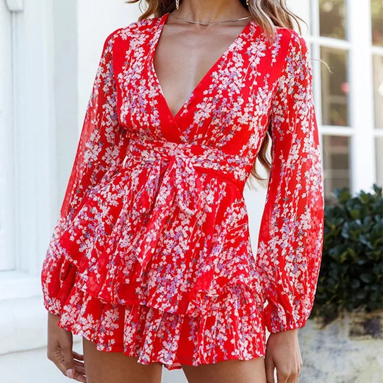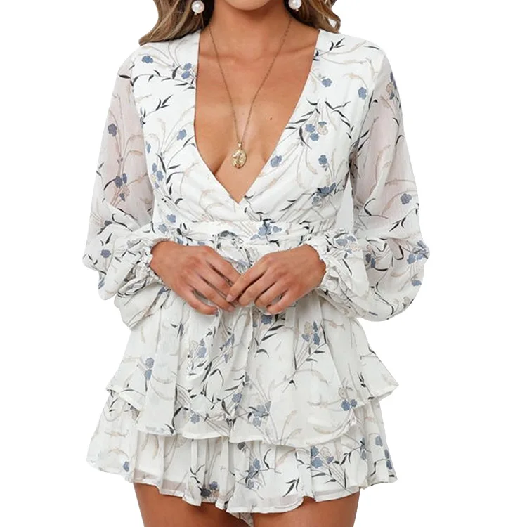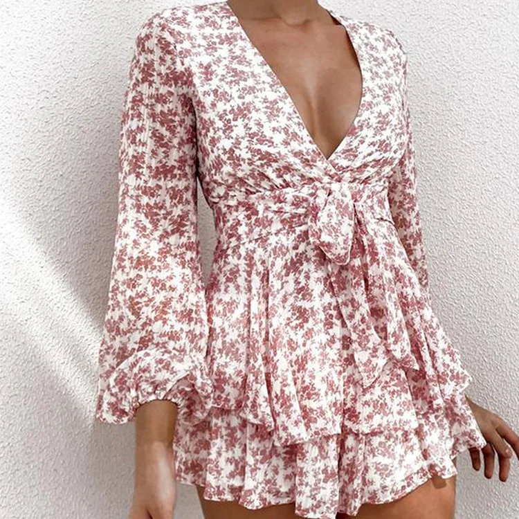 Купить 2021 Autumn Women's Long-sleeved Dress Temperament Printing V-neck Long-sleeved Waist Tie Short Jumpsuit In Stock за 1350рублей
