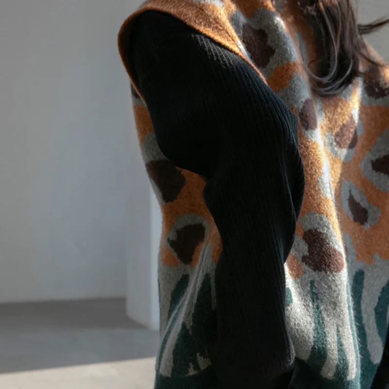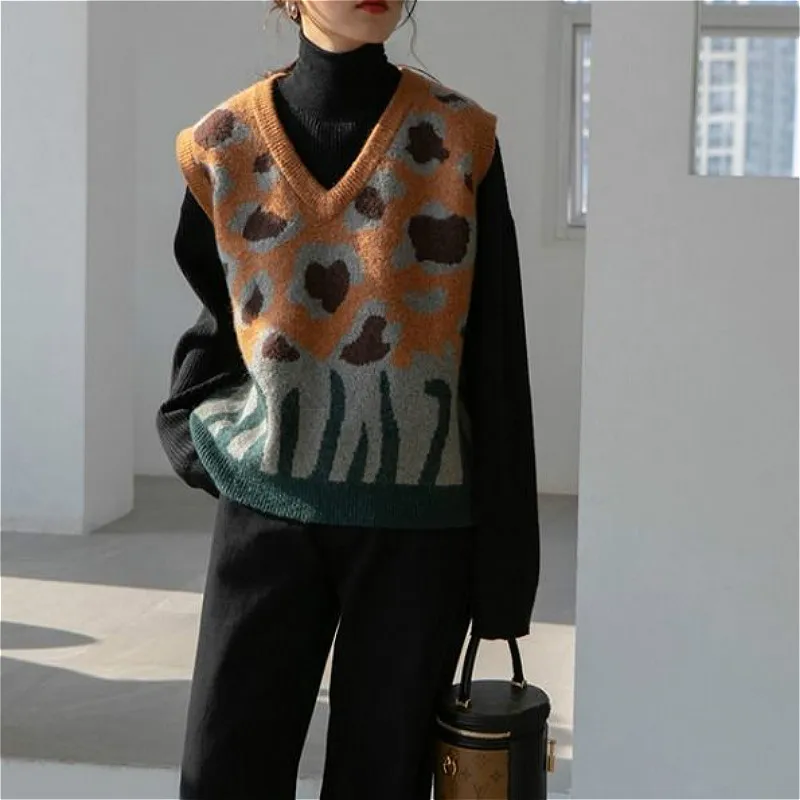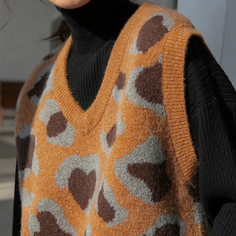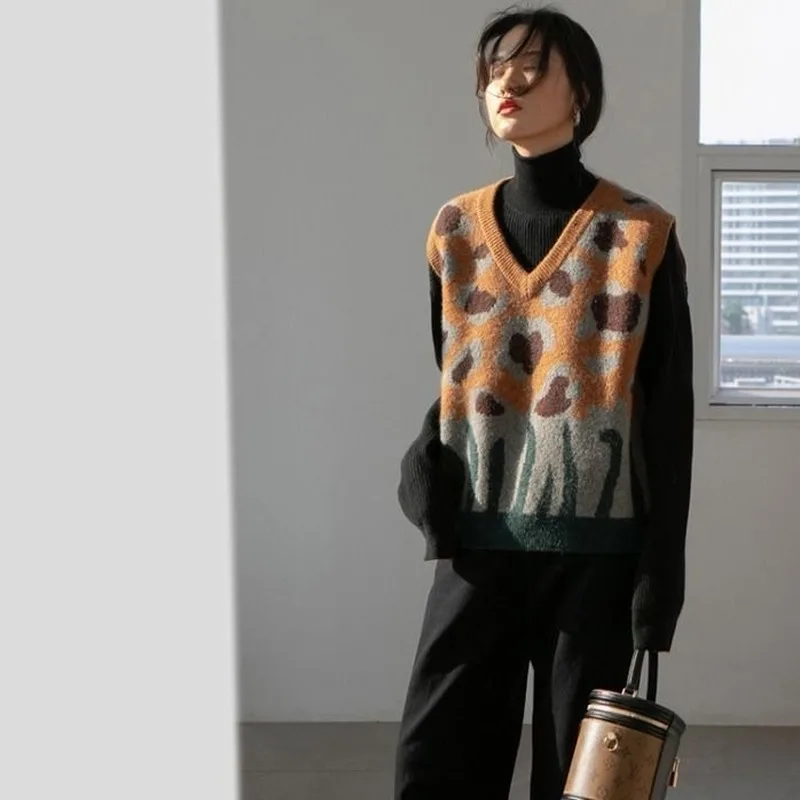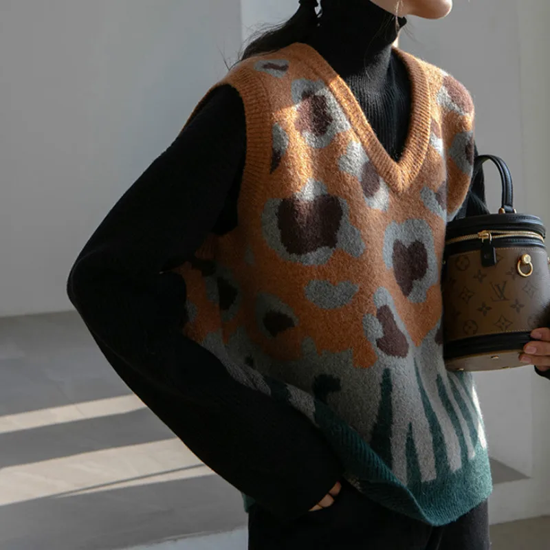 Купить 2021 Leopard Print Vest Sweater Brown Print V-neck All-match Chic Knitting Panelled Retro Loose Comfortable Popular Female Cozy за 550рублей