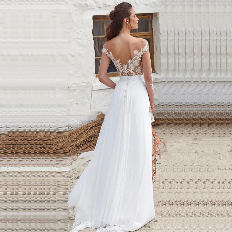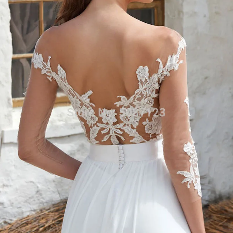 Купить 2021 Sexy Beach Wedding Dresses Chiffon Long Sleeves Bridal Gowns Sheer Neck Lace Appliques Ivory Vestidos De Noiva Floor Length за 4600рублей