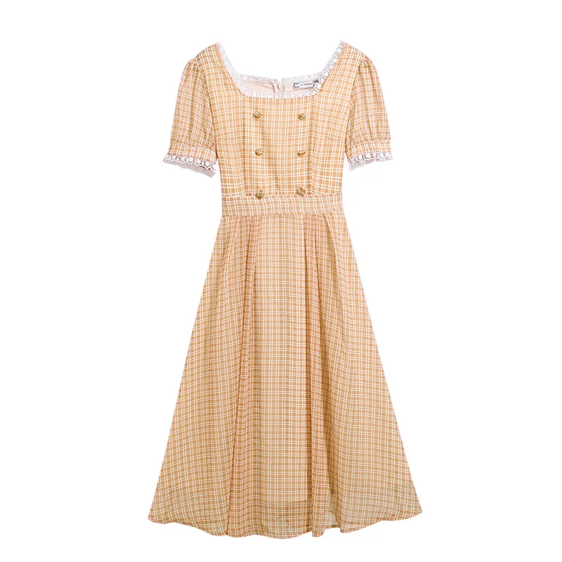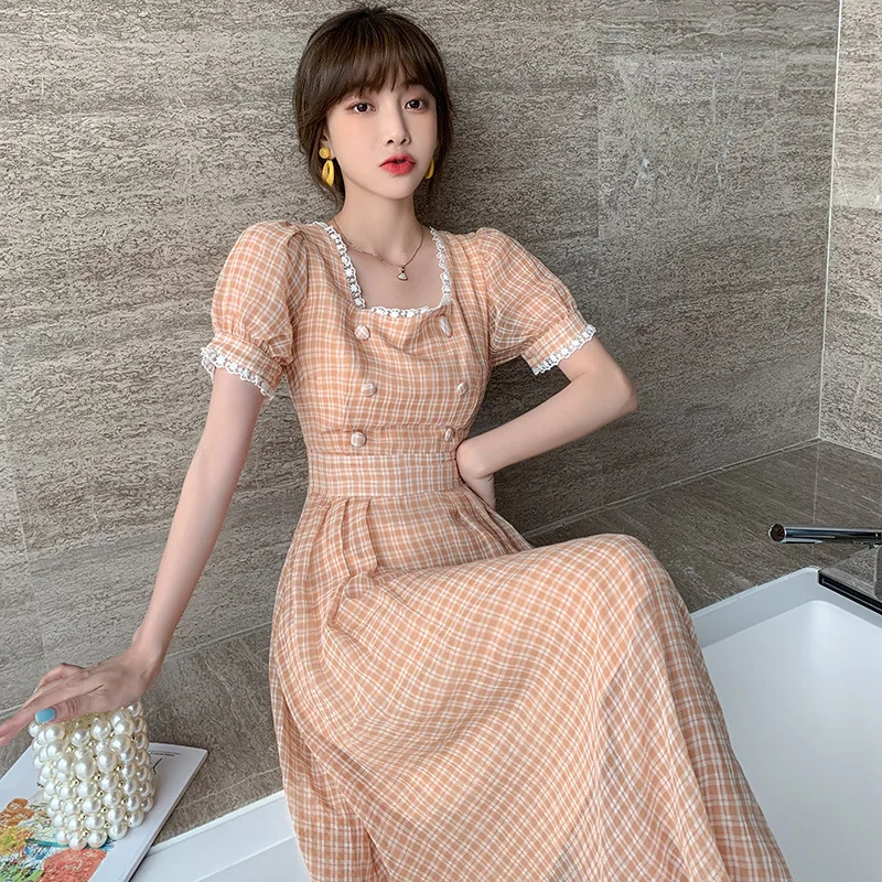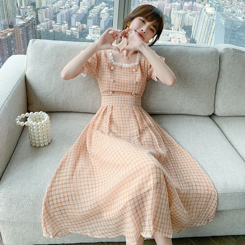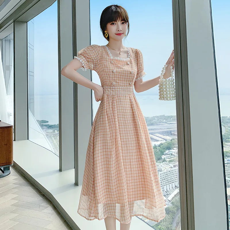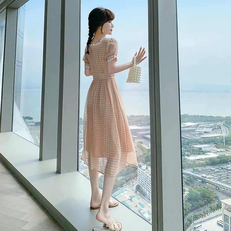 Купить 2021 Summer New High Waist Short Sleeved Women's Sleeve Chiffon Women Bodycon Dress Office Casual Plaid Print Midi A- Line Skirt за 2750рублей