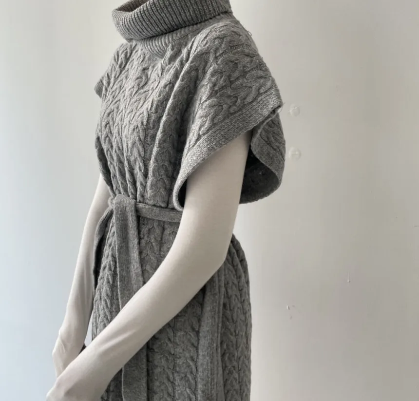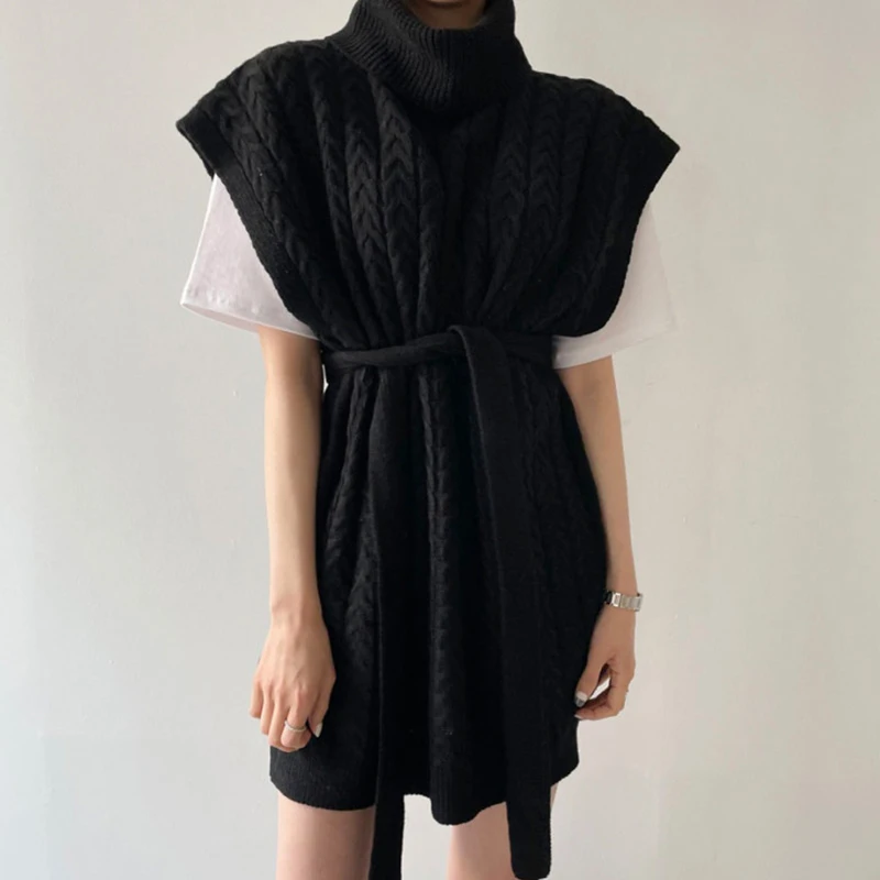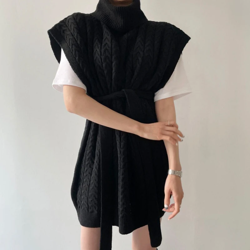 Купить 2021 Women All-Match Turtleneck Loose Spring Fall Solid Sweater Waistcoat with Belt Indie Female Vinatge Gray Twist Knitted Vest за 1000рублей