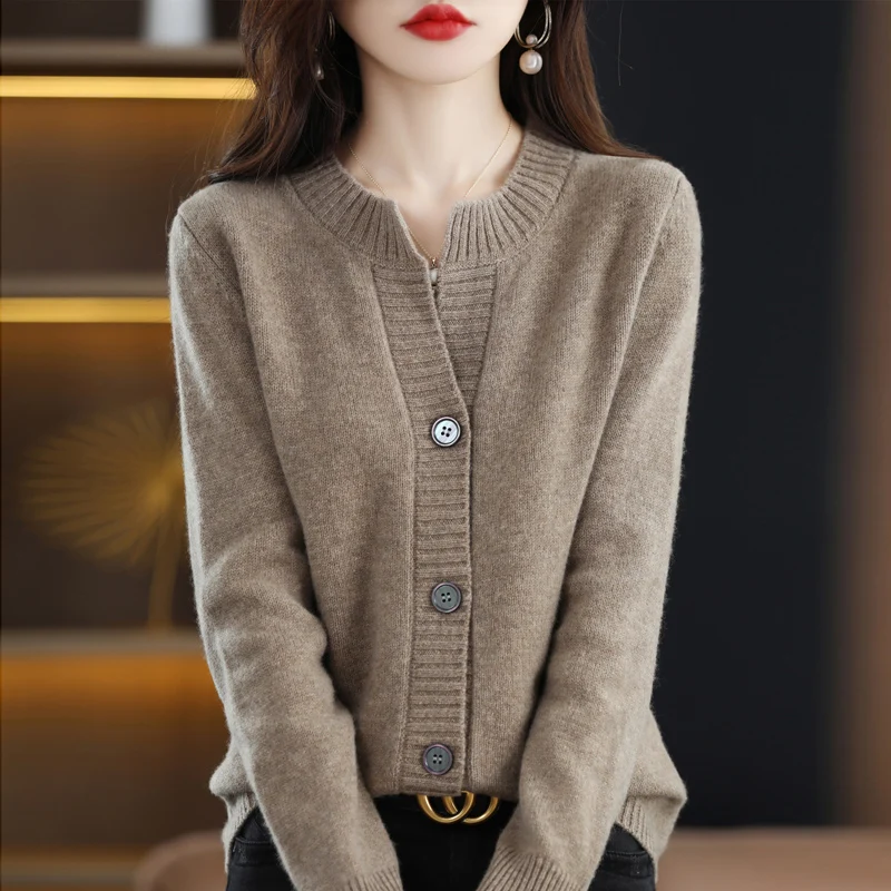Купить 2022 100% Pure Wool Knit Cardigan Jacket Women's Short Style Half Open Round Neck Sweater Loose Cashmere Base Sweater за 1850рублей