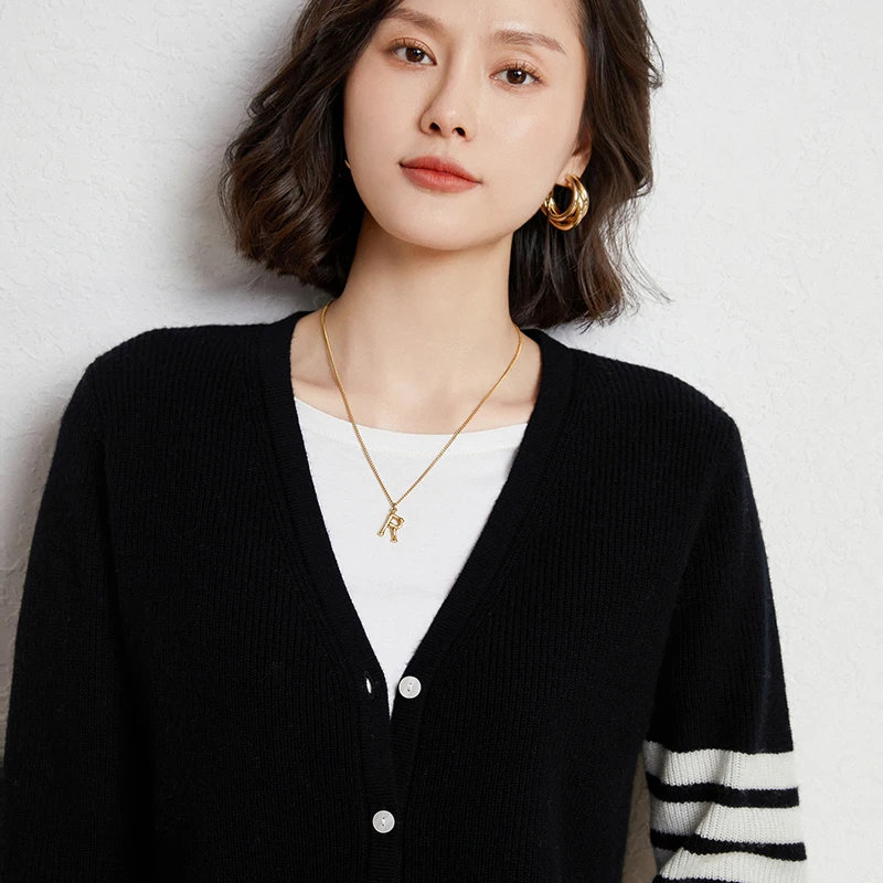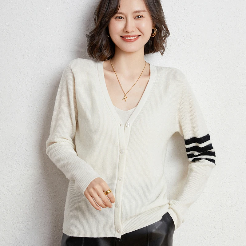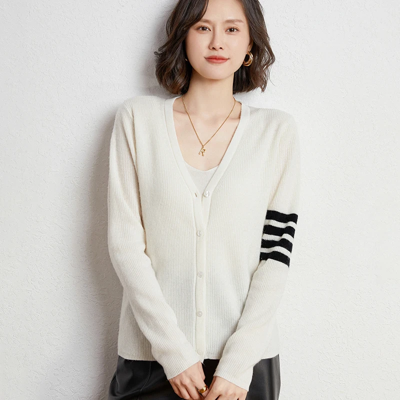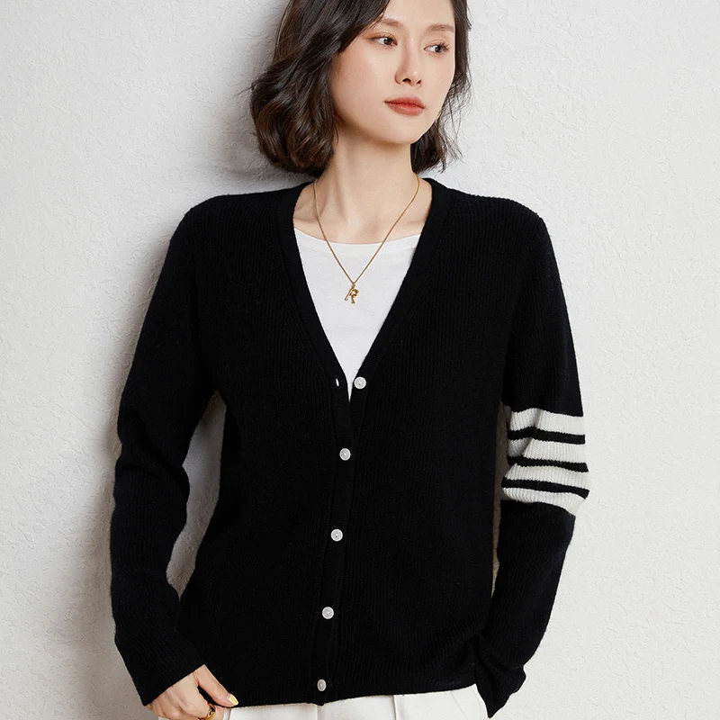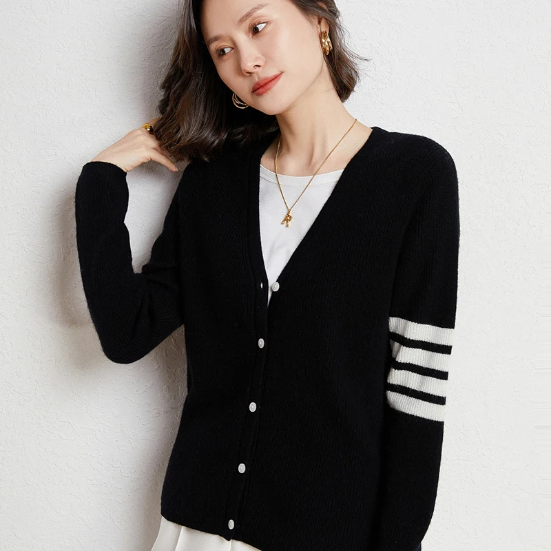 Купить 2022 Autumn And Winter New 100% Pure Wool Sweater College Style TB Casual V-neck Cardigan Sweater Classic Four-bar Jacket за 1600рублей
