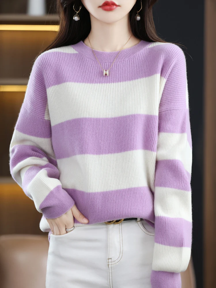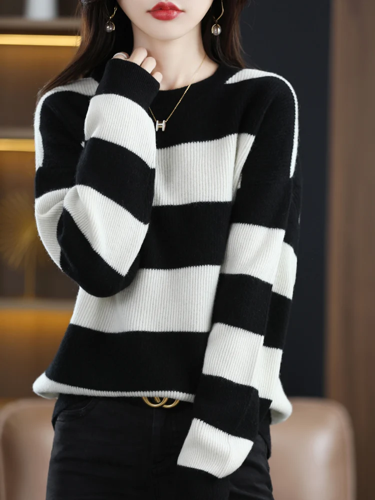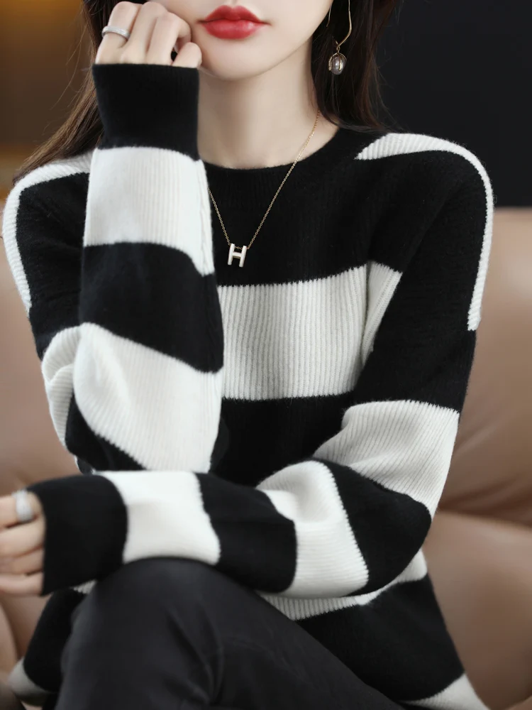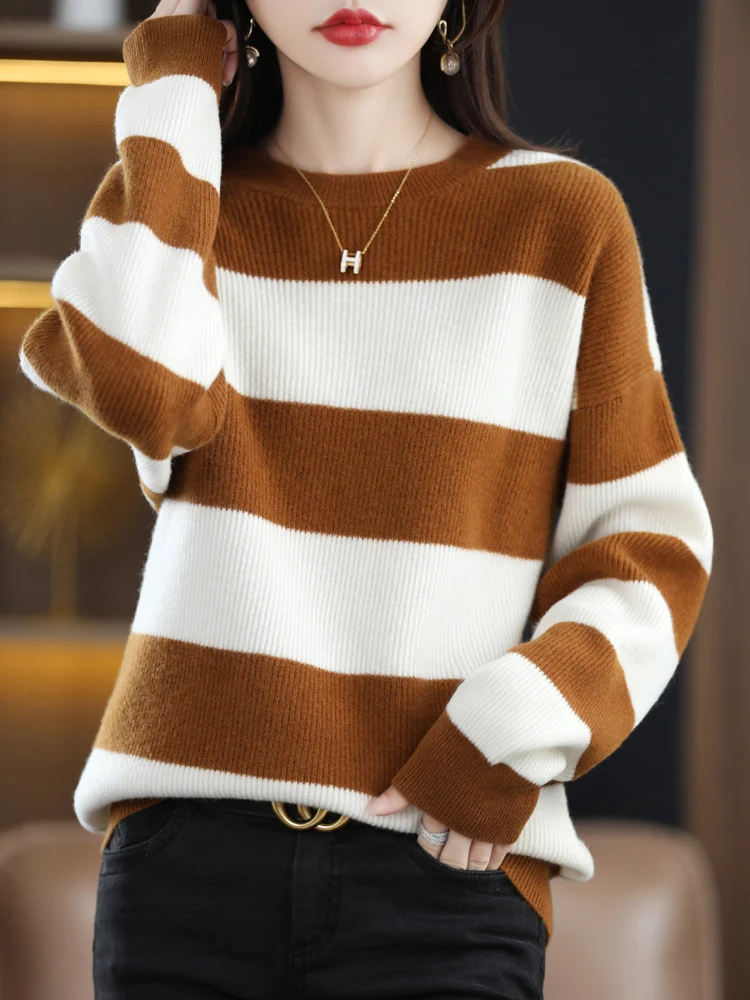 Купить 2022 Boutique Round Neck Striped Cashmere Sweater Female Pure Wool New Loose Lazy Knit Sweater Base For Autumn And Winter за 2200рублей