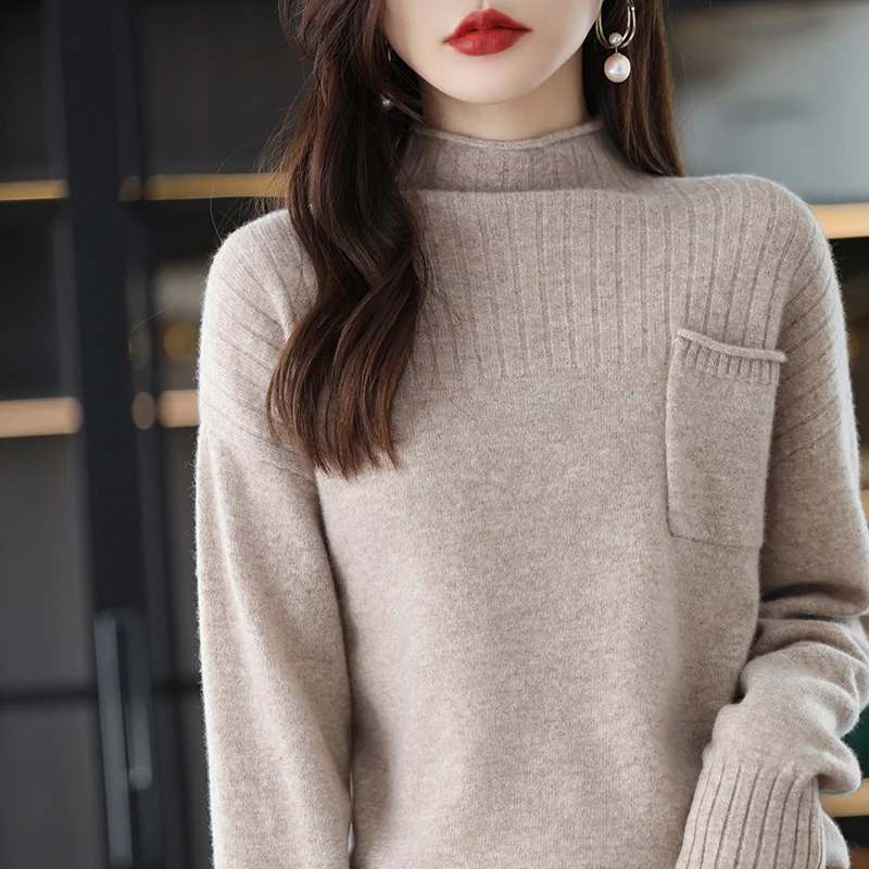 Купить 2022 Half High Collar Pocket Split Drawstring Hem 100 Pure Wool Sweater Autumn And Winter Women's Multi-Functional Knitting Top за 1800рублей