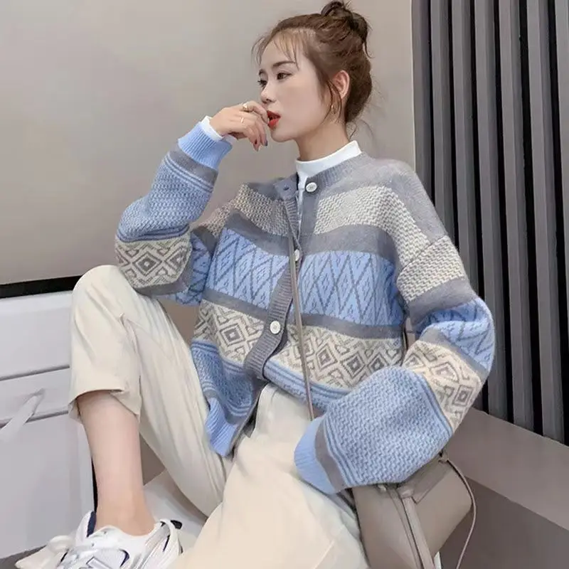 Купить 2022 Korean Autumn New Knitted Color Matching Cardigan Elegant Women Casual Western Style Pattern Wearing Loose Sweater Coat за 1250рублей