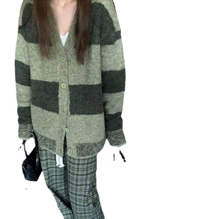 Купить 2022 Lazy Striped Sweater Women's Retro Design Sense Small Loose Knit Cardigan Jacket Top Women's Daily Commute за 1050рублей