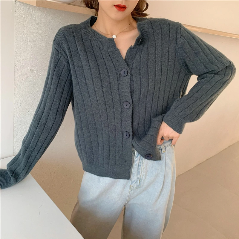 Купить 2022 Spring Autumn Long Sleeve O-Neck French Retro Knitted Tops Sweaters Female Solid Single-breasted Loose Stripe Top Fashion за 700рублей