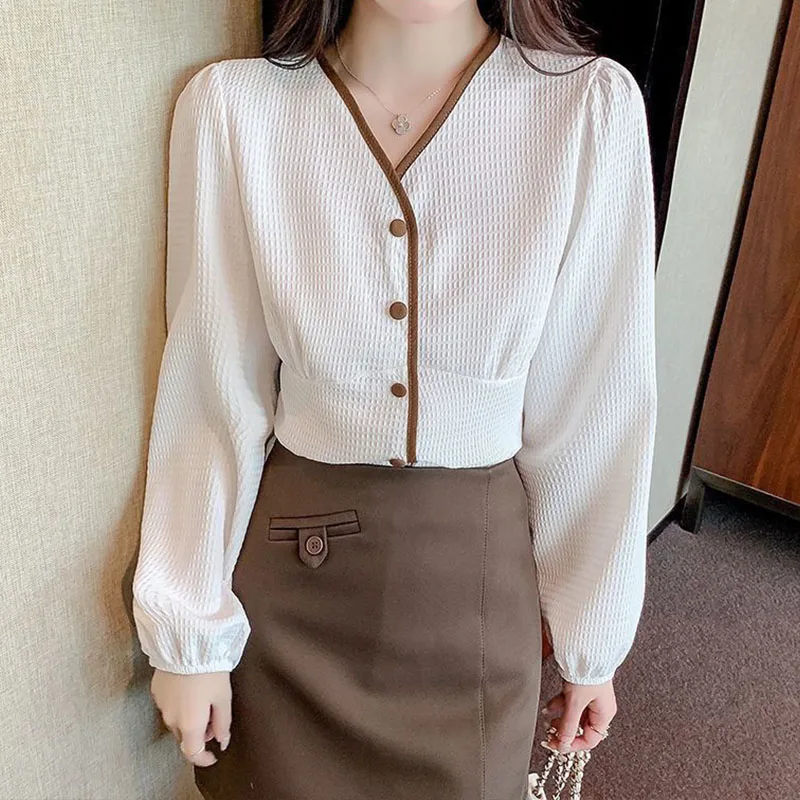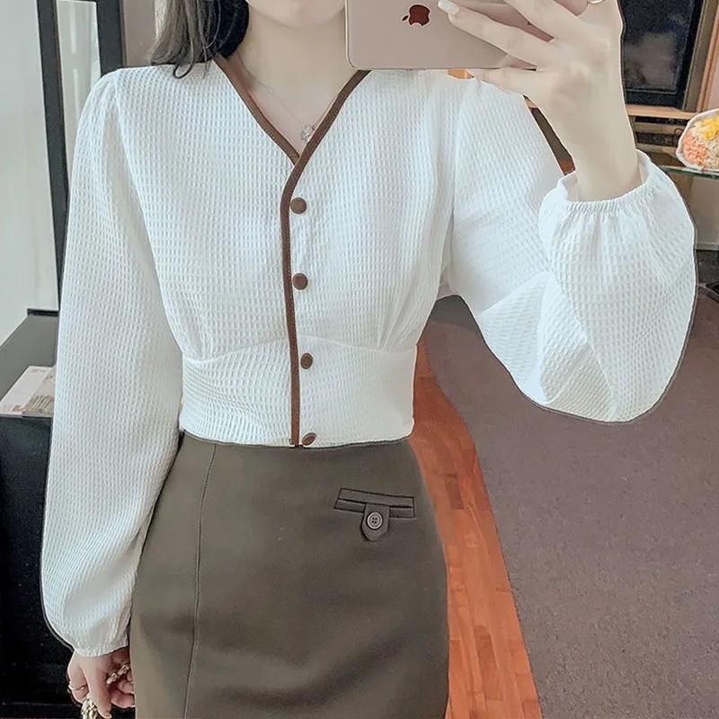 Купить 2022 Spring Autumn V-neck Shirt Women Buttons Design Pleat Slim Temperament Puff Sleeve Easy Matching Upper Outer Garment за 850рублей