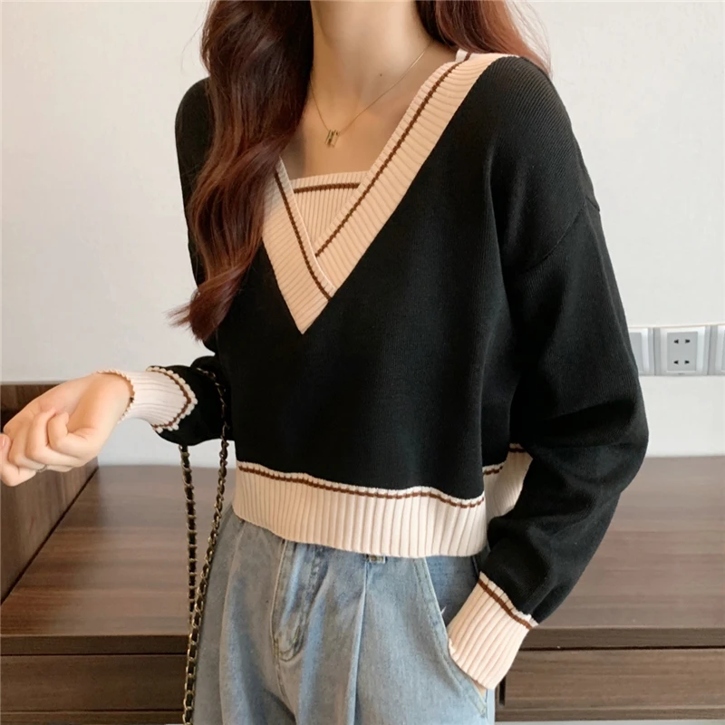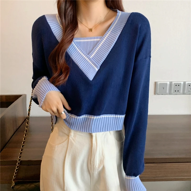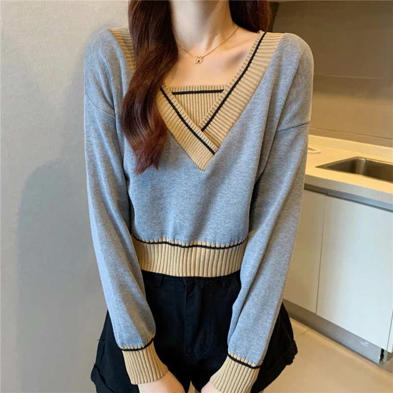 Купить 2022 Vintage Clothes Fake Two Piece Crop Top Sweater Women V-Neck Knitted Sweaters Spring Autumn Long Sleeve Pullover Pull Femme за 700рублей