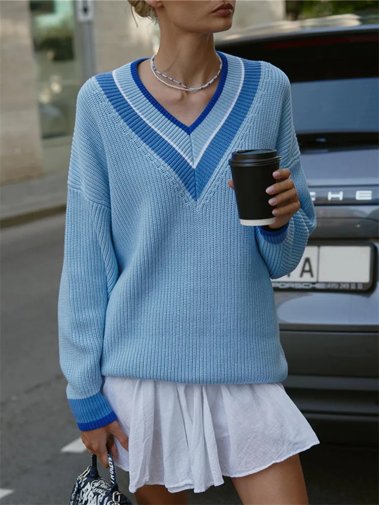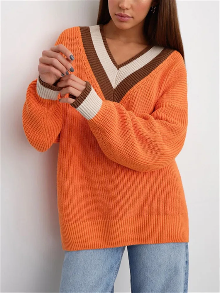 Купить 2022 Winter Autumn Women's Sweater Oversize Color Matching V Neck Striped Knitted Sweater Pullover Warm Loose Jumper Thick Lady за 1050рублей