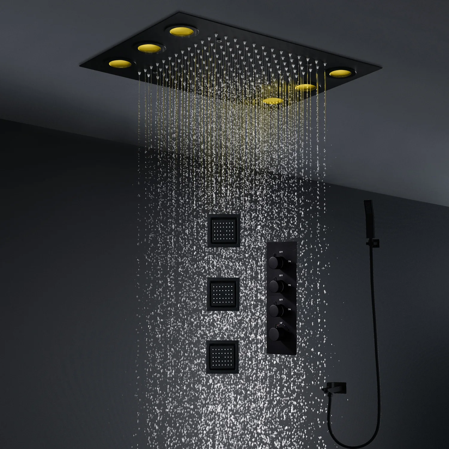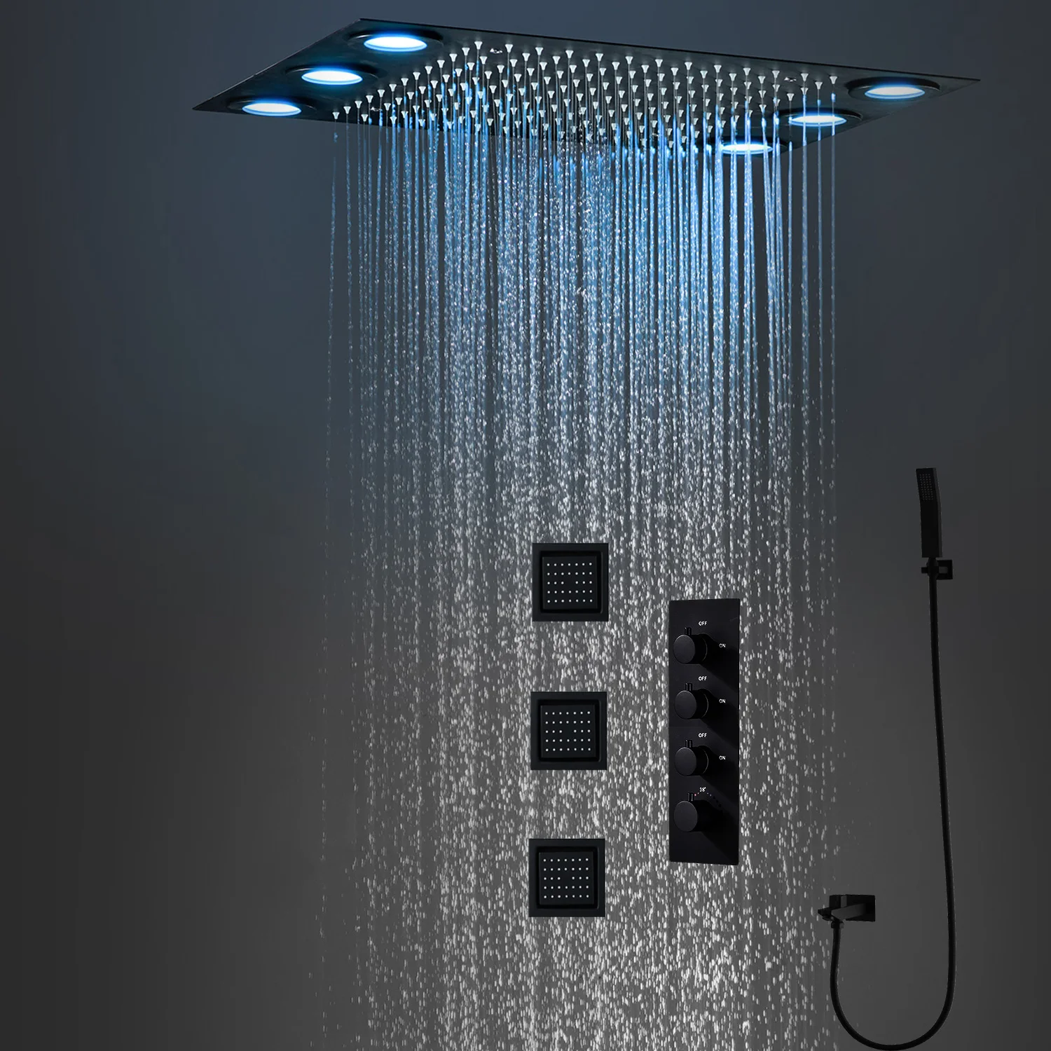 Купить 2023 High Quality Bathroom Black Colorful LED Shower Set Rainfall Showerhead Thermostatic Faucets System With Massage Body Jets за 15300рублей