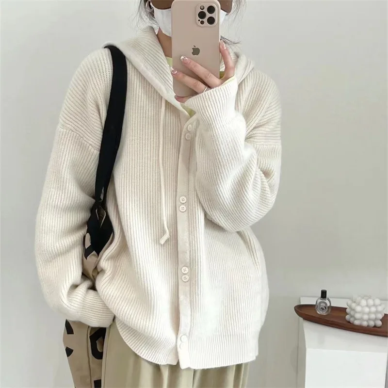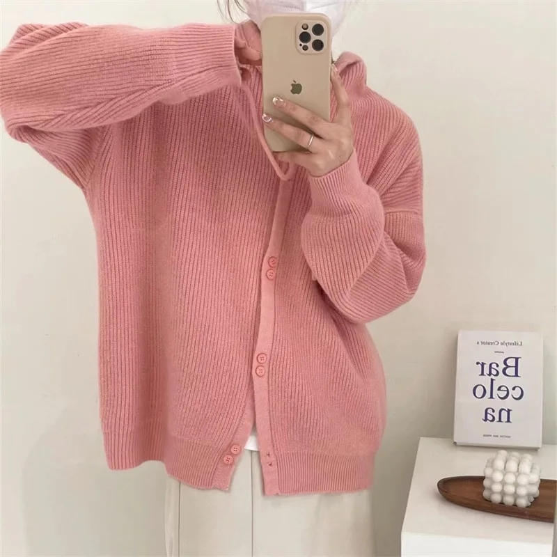 Купить 22Spring and Autumn Hooded Knitted Cardigan Women's New Soft Waxy Korean Version Loose Soft Fruit Color Sweater Women's Coat Top за 1300рублей