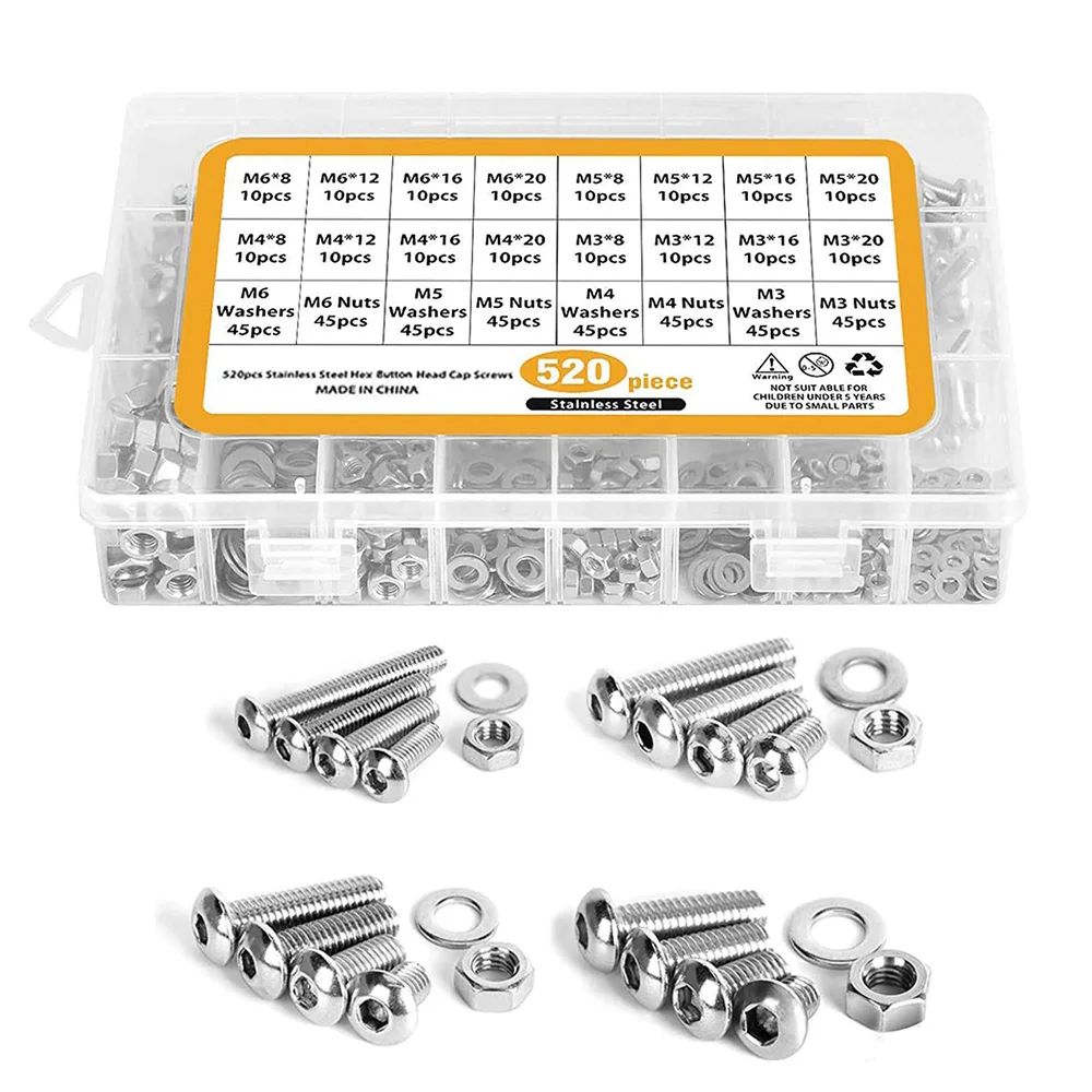 Купить 520pcs 304 Stainless Steel Screws and Nuts Washers,M3/M4/M5/M6 Hex Socket Head Cap Screws Assortment Set Kit with Storage Box за 1350рублей
