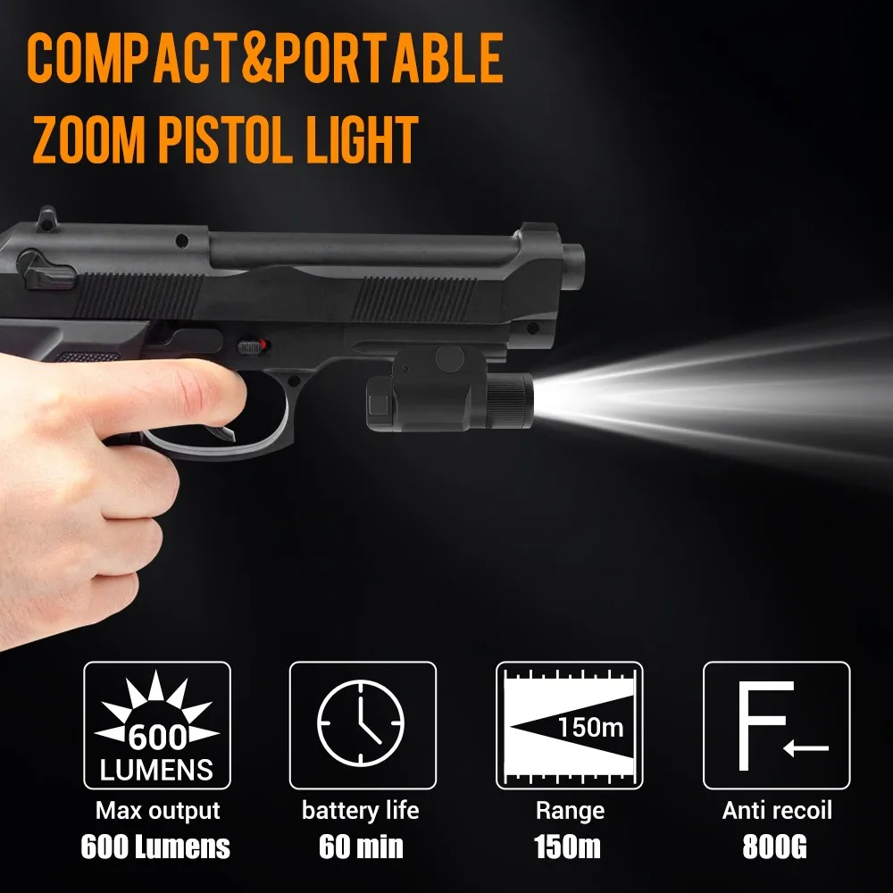 Купить 600 Lumens Zoomable Weapon Gun Light Tactical Handgun Pistol Light LED Flashlight Airsoft Quick Release Gun Light for 20mm Rail за 1800рублей