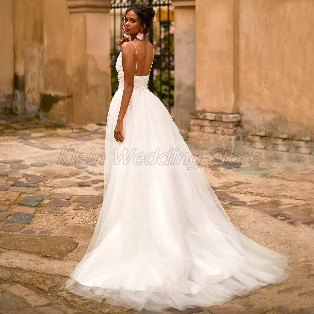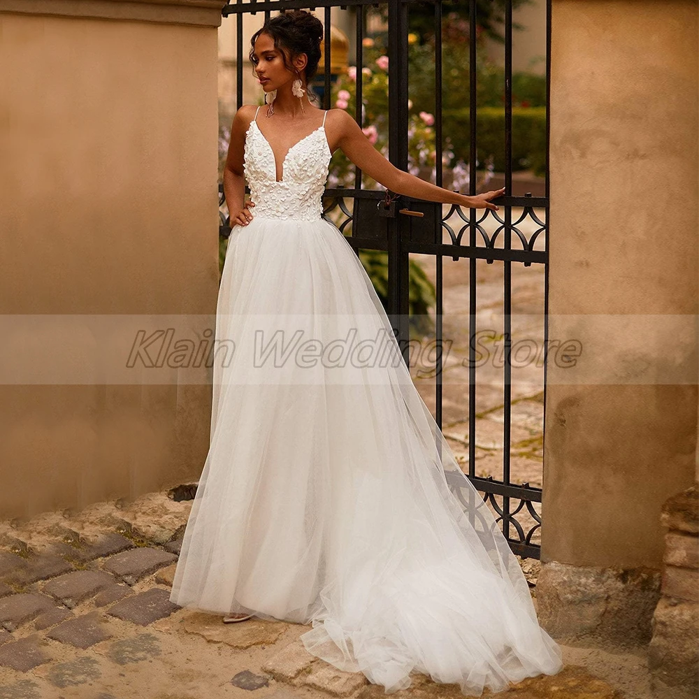 Купить A-Line Tulle Sexy Deep V-Neck Wedding Dress 2021 Spaghetti Straps 3D Flowers Sweep Train Backless Bridal Gowns Custom Made за 5150рублей