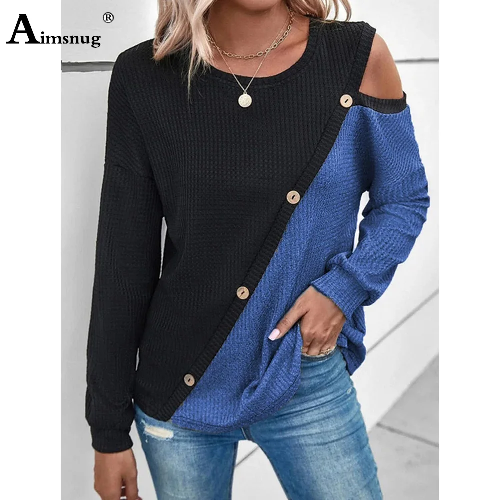 Купить Aimsnug Long-Sleeved Patchwork Sweaters Plush Jumpers Women's Irregular Buttons Top 2023 New Spring Cusual knitting Pullovers за 700рублей