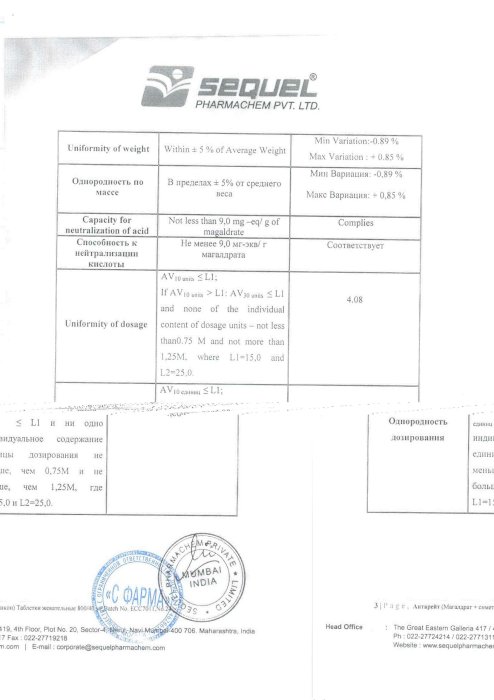 Действующие вещества: магалдрат – 800,00 мг, симетикон (в пересчете на диметилполисилоксан) – 61,54 (40,00) мг.