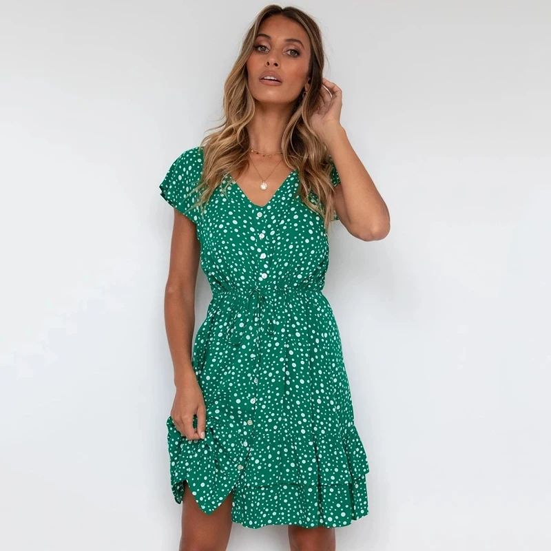 Купить Ardm Casual V Neck With Button Ruffled Summer Dress Dot Print Short Sleeve Drawstring Sweet Mini Dresses For Women 2021 за 800рублей