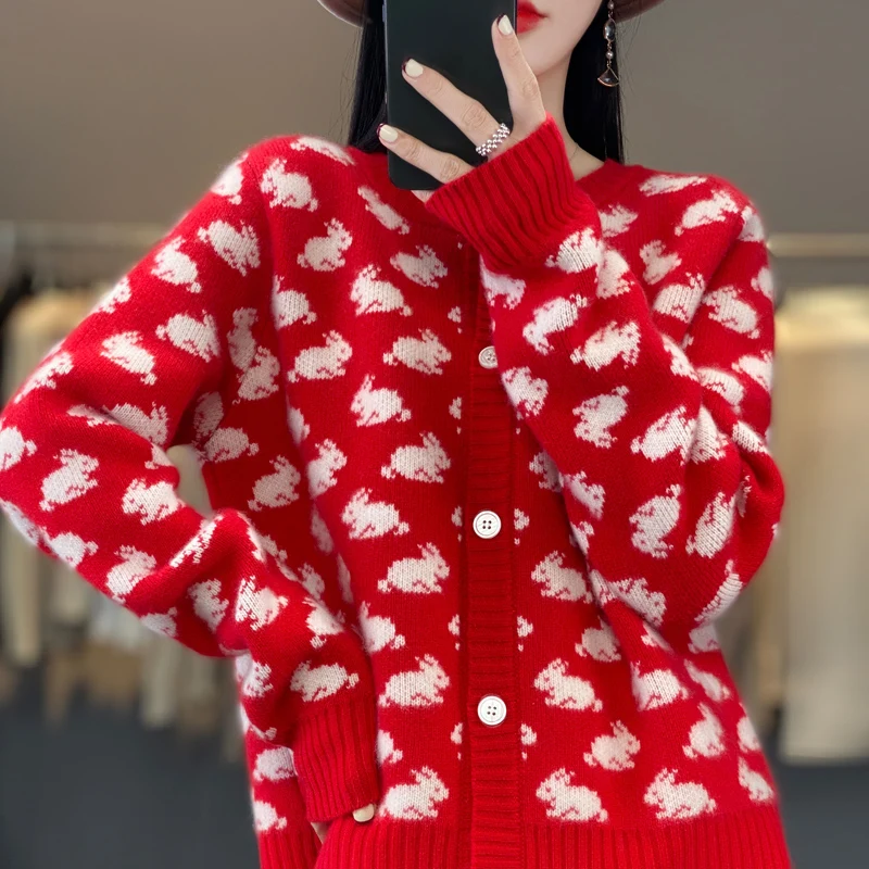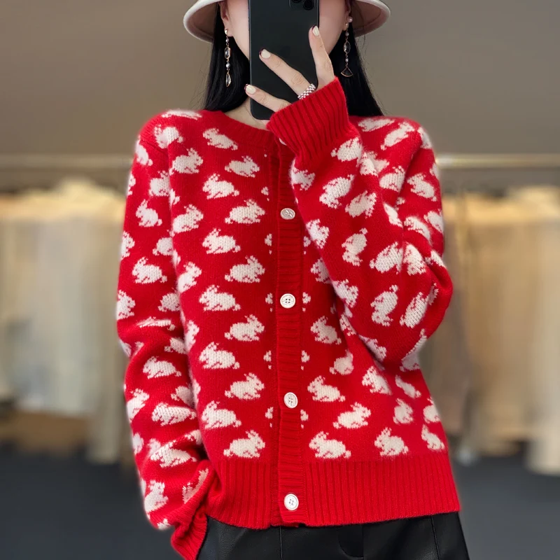 Купить Autumn And Winter Women's High-End 100% Wool Round Neck New Year Rabbit Pattern Knitted Cardigan Is Fashionable, Elegant And Hot за 2650рублей