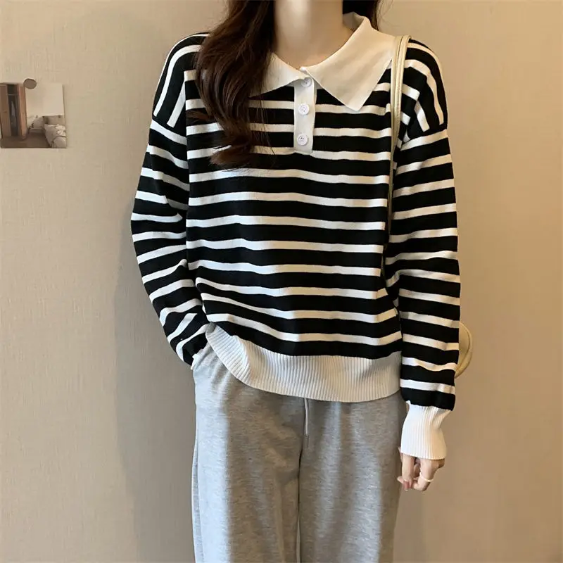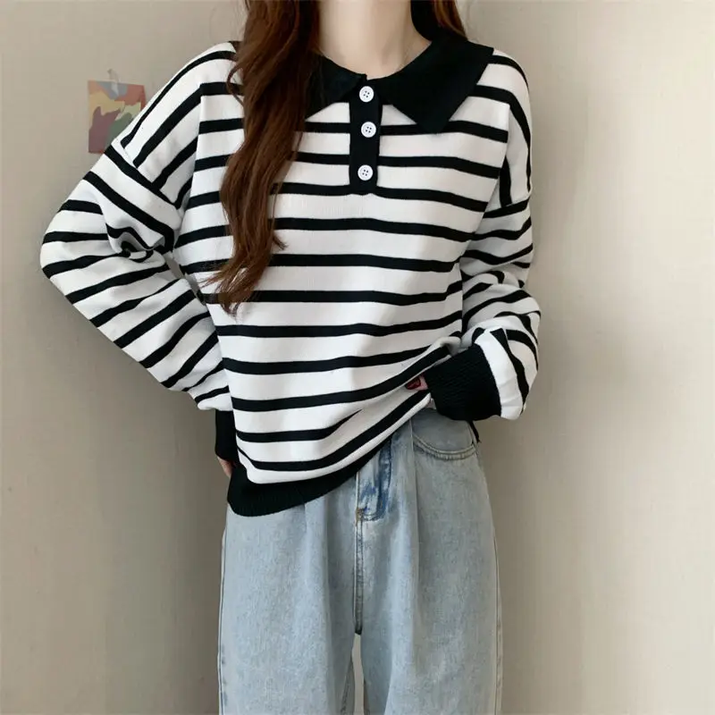 Купить Autumn Solar System Lazy Vintage Striped Polo Neckline Top 2022 Women Korean Version Casual Loose Button Long Sleeve Sweater за 850рублей