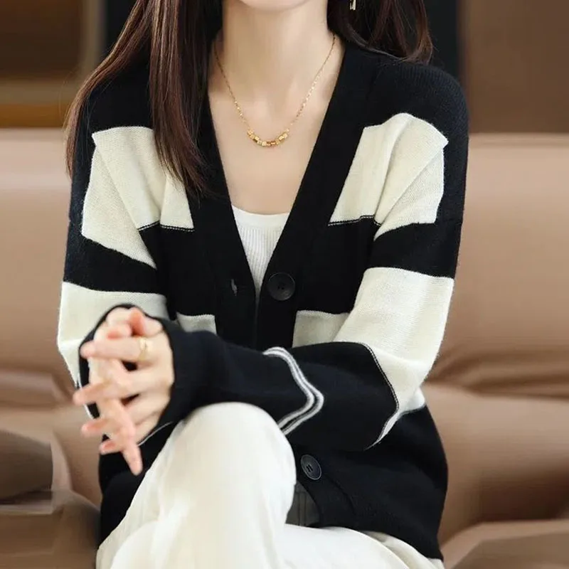 Купить Autumn Winter Green Navy Color Blocking V-Neck Single Breasted Cardigan Large Button Decoration Fashionable Korean Trend Loose за 1050рублей