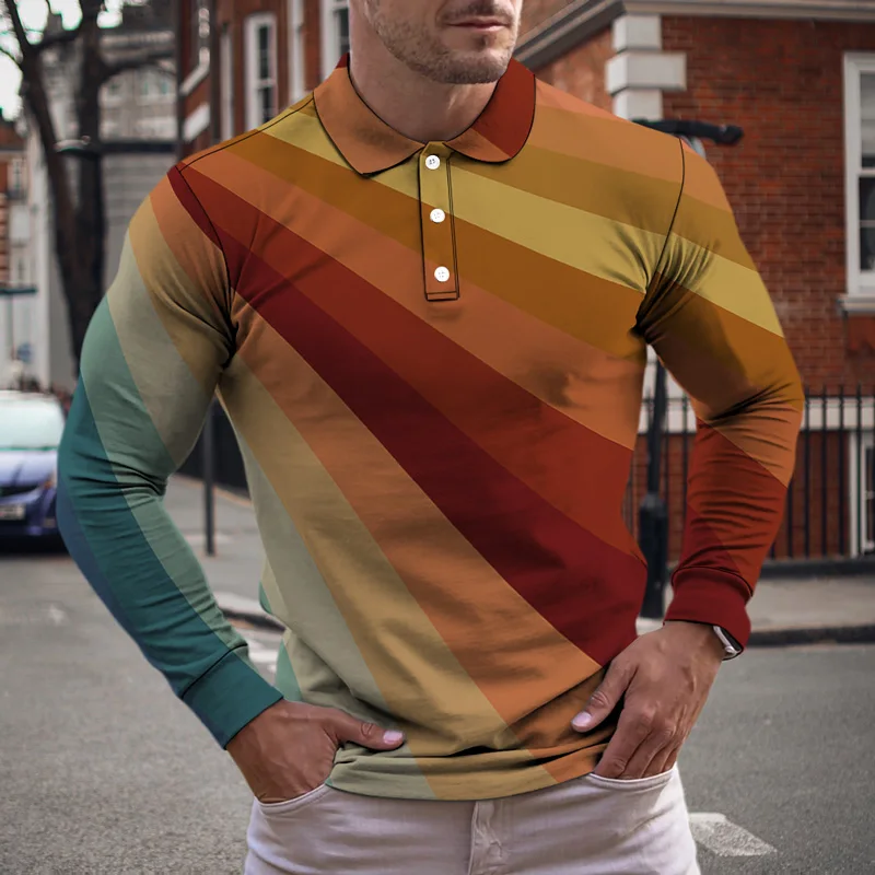 Купить Autumn Winter Men's Polo Long Sleeve Lapel Button 3D Print Gradient Multiple Colors Mature Man Top Pullover Casual Jog Style за 950рублей