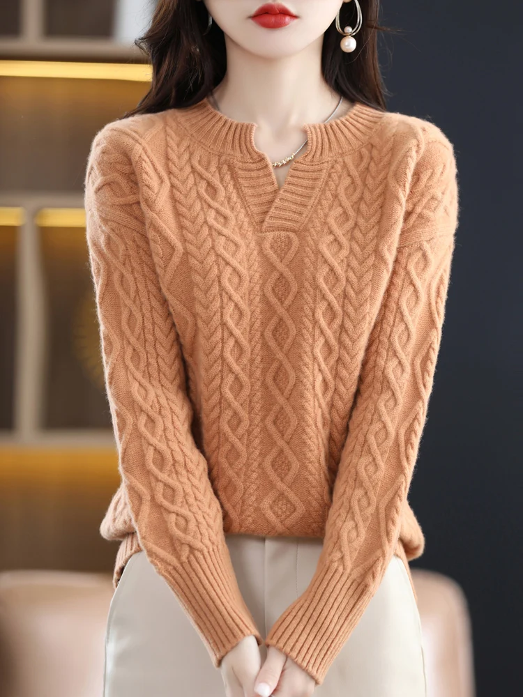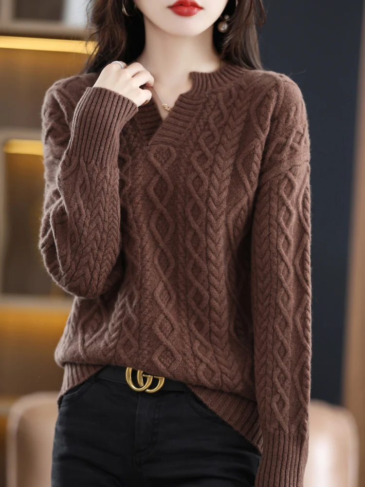 Купить Autumn Winter New V-Neck Thickened Cashmere Sweater For Women Loose Twisted Flower Pure Wool Knit Pullover Sweater Solid Color за 2950рублей